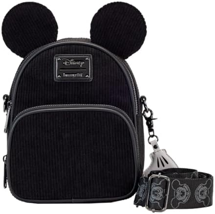 Get the upper hand on effortless celebratory fashion with our Loungefly Disney100 Corduroy Convertible Crossbody Bag. This stylish black bag features Mickey Mouse’s applique ears, which rise up over the top, and they’re covered in a fun, black corduroy material. The corduroy fabric continues over the front of the bag, the front pocket, and the sides. A vegan leather zipper charm of Mickey Mouse’s gloved hand tops off the look—and it’s removable, so you can swap it out with other zipper charms to change things up. The black strap, which is adjustable and convertible, carries a motif of Mickey Mouse’s face. On the back, debossed letters spell out “100 Years of Wonder.” Turn everyday outings into a reason to celebrate! The Loungefly Disney100 Corduroy Convertible Crossbody Bag is made of vegan leather (polyurethane). Bag has an adjustable, convertible shoulder strap, sturdy silver-colored metal hardware, and features applique, corduroy, and debossed details.