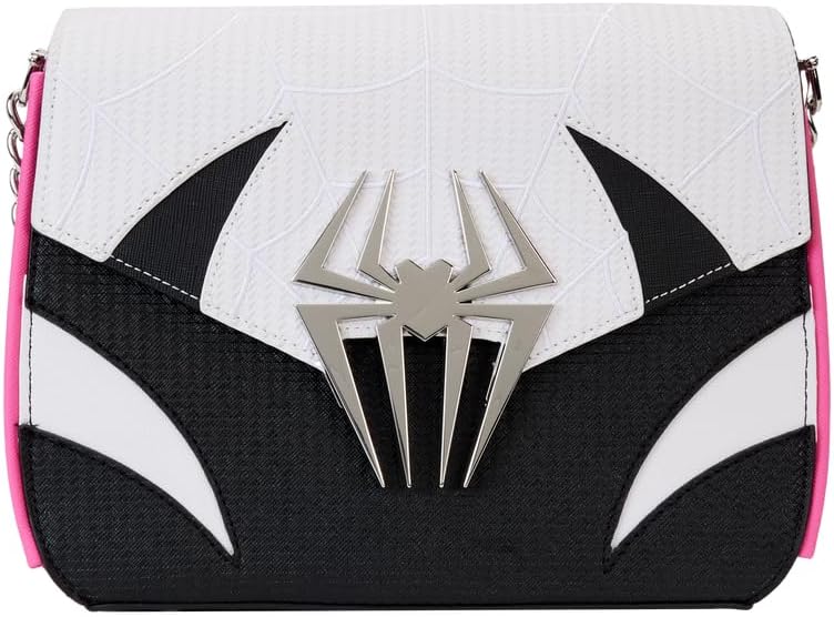 Let’s do this one more time! Bitten by a radioactive spider, Gwen Stacey takes the role of Spider-Gwen on the Loungefly Spider-Verse Spider-Gwen Crossbody Bag. On the front, a molded metal spider emblem secures the bag’s top flap. Striped details and spider webs recreate Gwen’s hero suit across the front and back of the design, while pink and blue webbing appears on the bag’s sides. This accessory makes a heroic addition to your next mission and will keep your belongings safe on your interdimensional travels. The Loungefly Spider-Verse Spider-Gwen Crossbody Bag is made of vegan leather (polyurethane). Bag has adjustable chain strap and shiny silver hardware. Additional features include applique, embossed, and printed details.