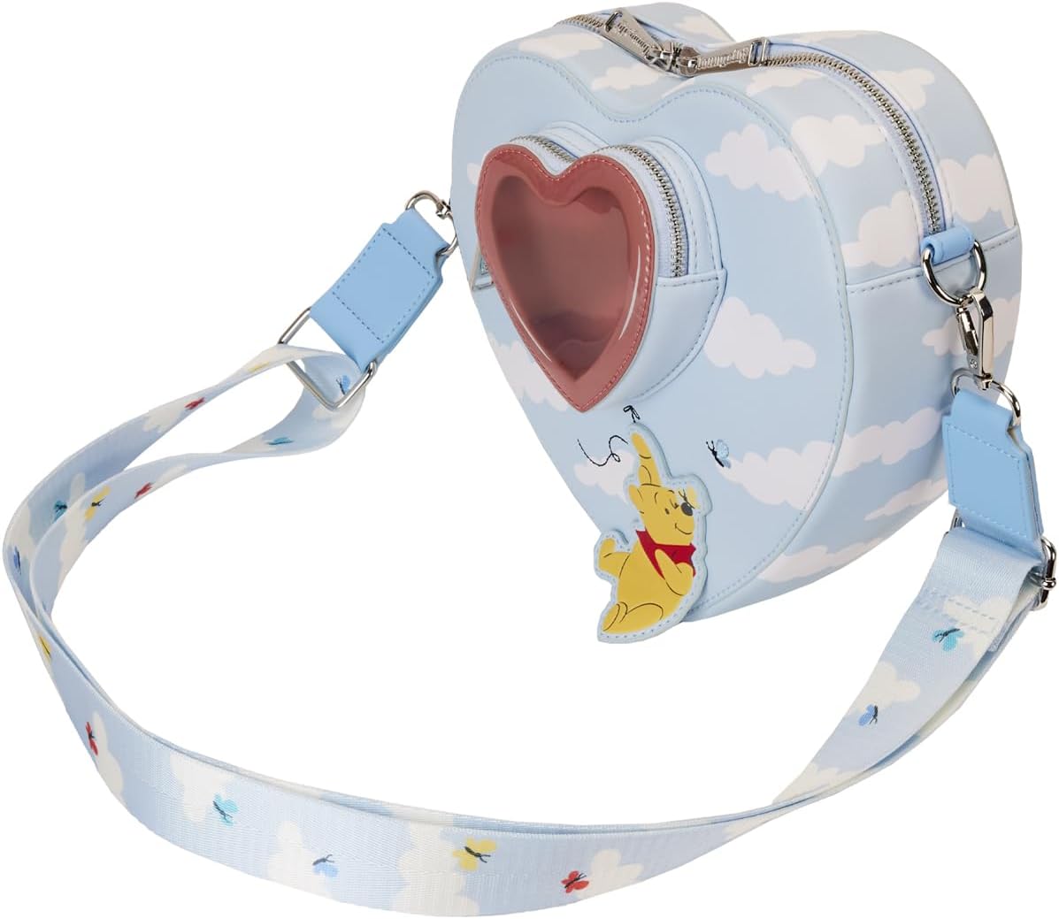 Embark on an adventure to the Hundred Acre Wood with the Loungefly Winnie the Pooh Balloons Heart Crossbody Bag! Crafted from vegan leather, this whimsical bag features delightful applique, embossed, and embroidered details that capture the charm of Pooh’s world. As you journey through the sky with Pooh and his friends, the clear PVC material reveals a heartwarming scene of colorful balloons floating amidst the clouds. The adjustable shoulder strap ensures comfortable carrying, allowing you to explore the wonders of the Hundred Acre Wood with ease. With a zipper closure across the top and a small front pocket, this crossbody bag provides secure storage for your essentials while adding a touch of playful flair to your outfit. Whether you’re picnicking with Pooh, bouncing with Tigger, or searching for honey with Eeyore, this officially licensed bag is the perfect accessory for any Winnie the Pooh fan. Measuring approximately 9 inches wide by 8.3 inches high by 3 inches deep, this bag offers ample space for your belongings while capturing the spirit of friendship and adventure. So grab your hunny pot and set off on a sky-high journey with Pooh and his beloved pals! – Crossbody Bag – Shoulder Strap